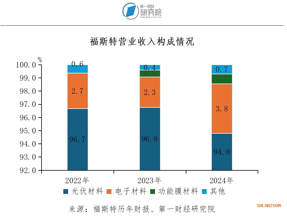 随着国内光伏行业快速发展,光伏产业的竞争日趋激烈,市场需求也在不断变化。为继续保持竞争力,福斯特进一步实施了产品跨业的经营战略。2015年福斯特提出“立足光伏主业,大力发展其他新材料产业”的发展战略,决定将产业方向从光伏封装材料扩展到电子材料等新兴产业领域。对此,林建华表示,鸡蛋不能放在一个篮子里。将产品延伸至新材料领域,福斯特不仅提升了自身产品的多样性,还增强了盈利能力。2024年,福斯特电子材料营业收入7.2亿元,同比增长38.2%。目前,福斯特形成了光伏材料、电子材料和功能膜材料的多元化业务布局,在内部管理上成立了光伏材料事业部、电子材料事业部、功能膜材料事业部、涂布材料事业部四大事业部。