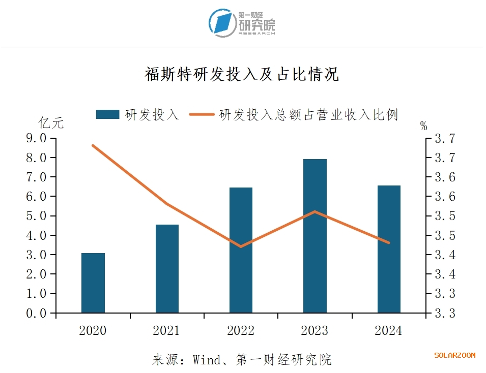 福斯特能够形成多领域业务发展格局,离不开强大的技术研发实力作为重要支撑。福斯特自成立以来,一直注重技术研发和创新。2024年,福斯特研发投入6.6亿元,占营业收入的比例达3.4%,研发技术人员为715人,占总员工人数的比例达15.3%。此外,企业还拥有浙江福斯特新材料研究院、浙江省光伏封装材料工程技术研究中心等多个研发平台,为技术研发提供了强有力的支持。截至2024年底,福斯特累计申请发明专利和实用新型专利742项和189项,其中授权有效的发明专利和实用新型专利分别为301项和136项,核心技术覆盖光伏胶膜材料、工艺优化及设备创新等领域。在海外知识产权保护方面,福斯特通过国际化专利布局与风险预警机制,保证其在全球市场的合规性与竞争力。2024年,企业新增16项国外专利申请,重点推进欧美日韩等目标市场的专利布局。同时,福斯特与海外顶级律师事务所合作,针对目标市场建立专利风险预警模型,通过监测潜在的侵权诉讼风险,制定应急预案,提前识别和规避可能的法律问题。