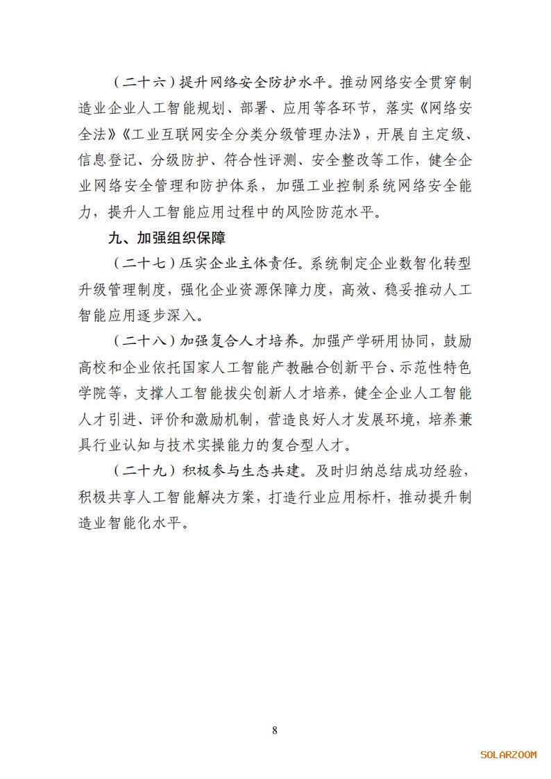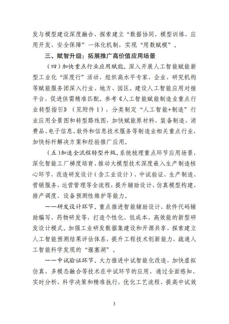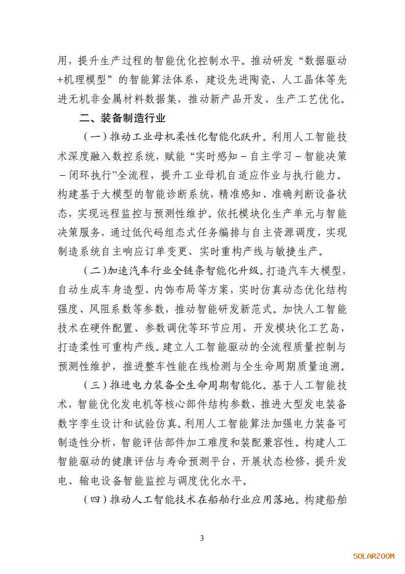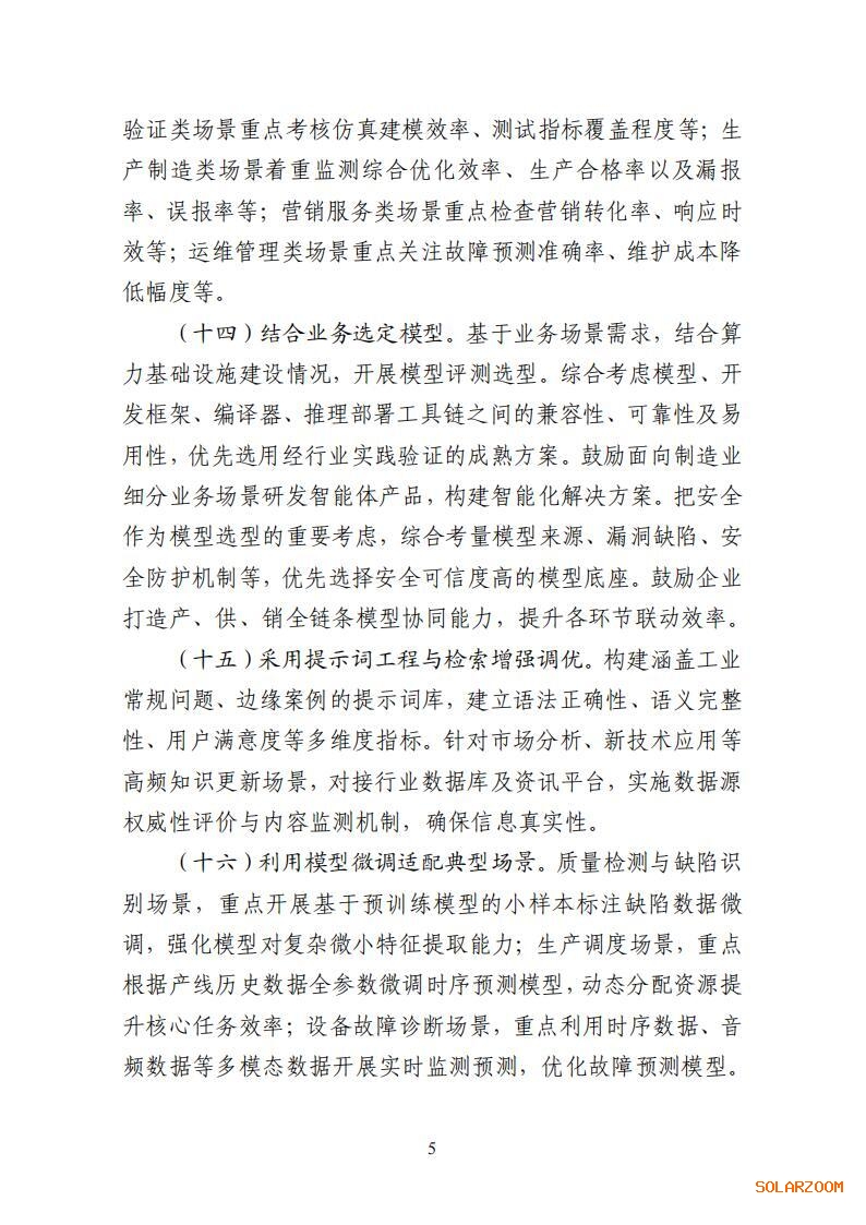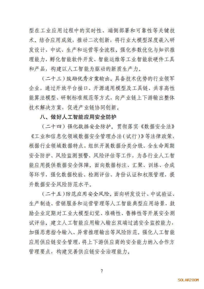 文件指出,深化人工智能技术在绿色制造领域融合应用,针对能源和碳排放管理、资源循环利用等场景需求,研发推广智能化绿色化协同解决方案。打造一批面向行业的应用安全解决方案,加快安全大模型、智能体等落地应用,构建安全运行体系,提升工业领域安全水平。