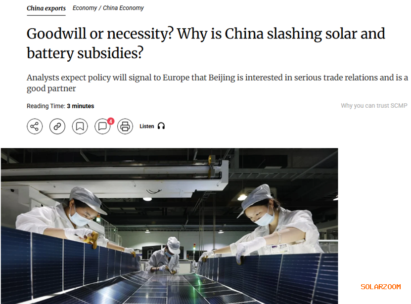 《南华早报》近日发文称,中国政府将在未来几个月取消太阳能电池板和电池的出口补贴,主要目的是为了抑制国内过度竞争,巩固中国在占主导地位的两个行业中的地位,并预计这将有助于缓解与欧洲的贸易紧张局势。