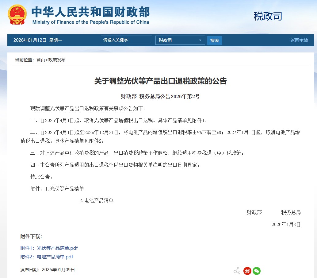 1月9日,财政部、税务总局发布《关于调整光伏等产品出口退税政策的公告》,宣布自2026年4月1日起,取消光伏产品增值税出口退税。这意味着光伏的“退税补贴时代”即将结束。