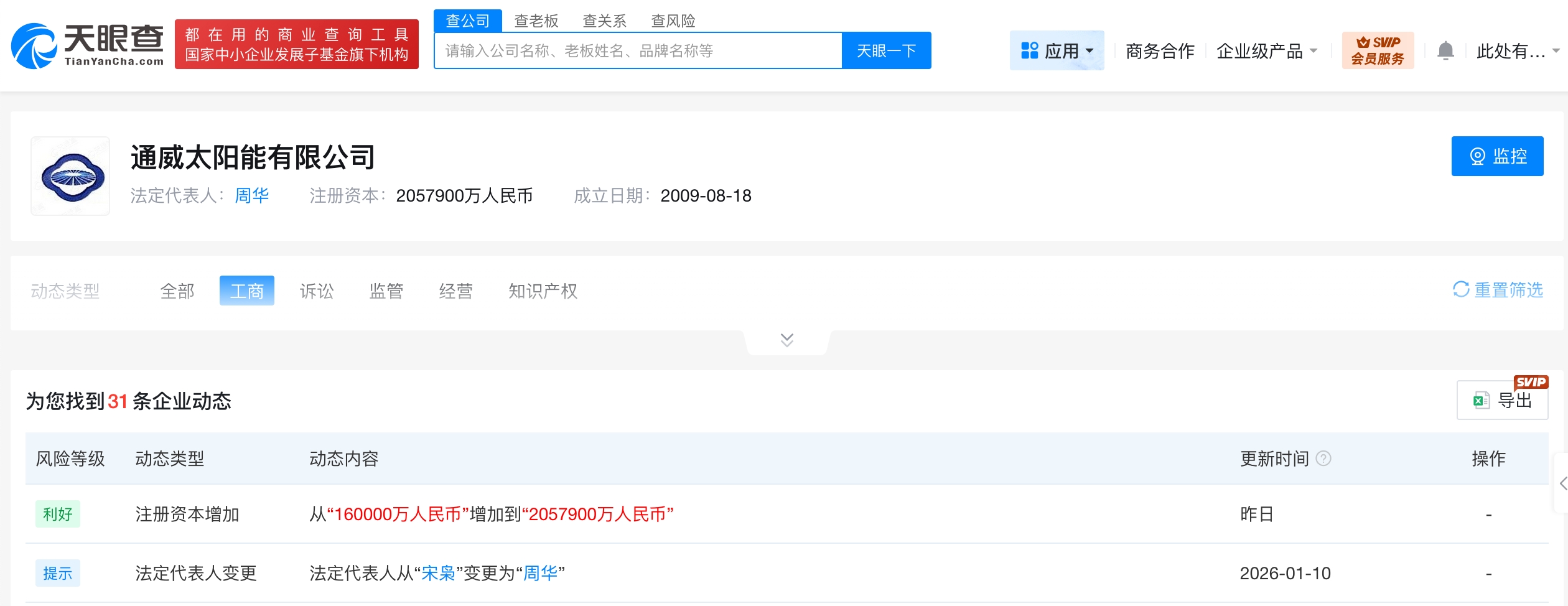 天眼查工商信息显示,近日,通威太阳能有限公司发生工商变更,注册资本由16亿元人民币增至205.79亿元人民币,增幅约1186%,同时,法定代表人由宋枭变更为周华。该公司成立于2009年8月,经营范围为电器机械及器材制造、安装,电池制造,燃气、太阳能及类似能源家用器具制造,商品批发与零售,进出口业,商务服务业,专业技术服务业。股东信息显示,该公司由通威股份(600438)全资持股。