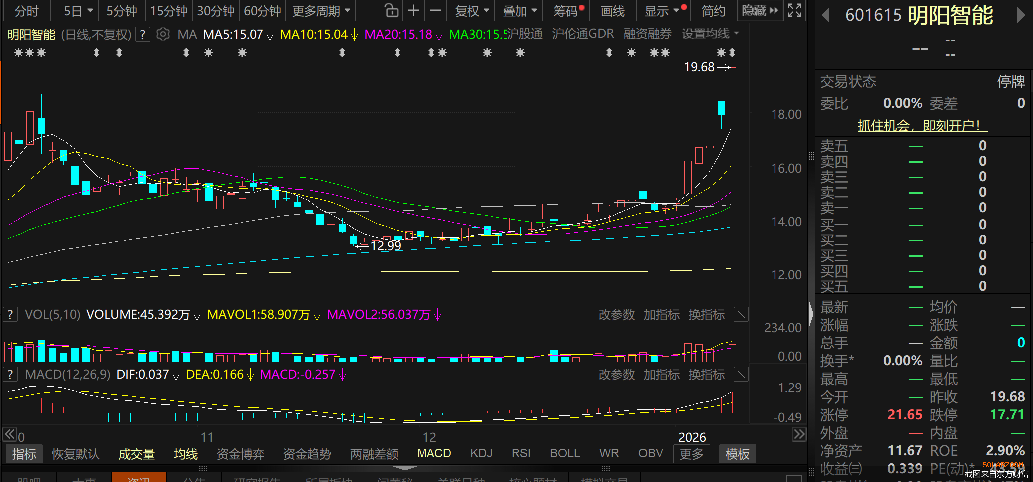 二级市场上,1月12日,明阳智能涨停收盘,收于涨停价19.68元/股,总市值445.1亿元。将时间线拉长来看,1月6日—12日这5个交易日,明阳智能区间累计涨幅达33.6%,同期大盘涨幅为3.53%。