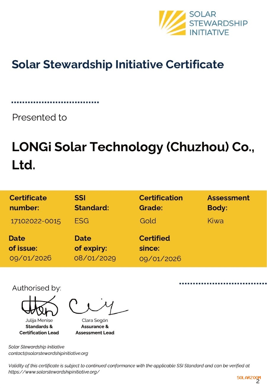 近日,隆基滁州基地凭借卓越的可持续发展实践,成为全球首家通过SSI(Solar Stewardship Initiative)-ESG标准审计并获得“金质勋章”认证的光伏企业。这一里程碑式的成就不仅彰显了隆基在环境、社会和治理(ESG)领域的全球领先地位,更为行业树立了可持续发展的新标杆。