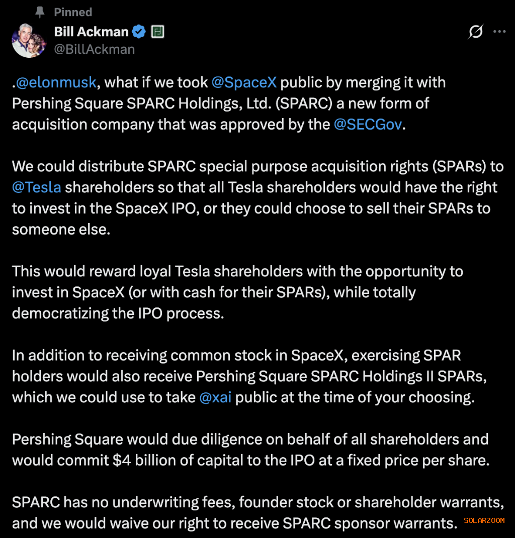 亿万富翁Bill Ackman提出通过其创建的特殊目的收购权工具(SPARC)让SpaceX上市,这一创新结构将绕过传统IPO流程,并赋予特斯拉股东优先投资权。