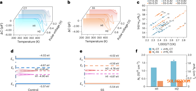 图4:缺陷表征。a、b, 在脉冲电压为0.2 V、0.4 V和0.6 V 条件下,CT样品(a)和 SS 样品(b)的 O-DLTS 信号。两个负峰(H1 和 H2)对应于Sb2(S,Se)3中的空穴陷阱(施主型缺陷)。c, 由 O-DLTS 信号得到的 Arrhenius 作图,其中 vth 表示热速度。c 图中的数据点通过对 O-DLTS 信号中包含的内部瞬态过程进行离散拉普拉斯变换计算获得,实线为对数据点的线性拟合结果。d、e, 在脉冲电压为 0.2 V 条件下,CT 和 SS 样品的能带结构及缺陷能级示意图。其中 Ec、Ev 和 EF分别表示导带底(CBM)、价带顶(VBM)和费米能级。各能级均以对应的电子伏特(eV)数值标注。锥形阴影区域表示缺陷的俘获截面大小(开口宽度)及缺陷密度(延伸程度)。f, 在脉冲电压为 0.2 V 条件下,H1 和 H2 缺陷对应的缺陷密度 NT及 (σ × NT) 的数值。为清晰展示相差一个至两个数量级的数据,右侧纵坐标轴采用了断轴处理。