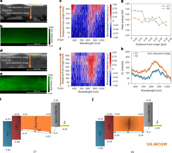 图3:横截面阴极发光(CL)光谱及能带边分布。a–c, CT 样品横截面的扫描电子显微镜(SEM)图像(a)、阴极发光(CL)分布图(b)以及沿起始点方向(由橙色箭头标示)的CL光谱(c)。d–f, SS样品横截面的扫描电子显微镜(SEM)图像(d)、阴极发光(CL)分布图(e)以及沿起始点方向(由橙色箭头标示)的CL光谱(f)。其中,a和d中橙色箭头的起点定义为Origin(起始点)。超薄横截面样品均通过聚焦离子束(FIB)制备。在b和e中,图像亮度对应于选定带通波长窗口内的CL强度。不同深度处获得的光谱线型叠加于同一图中,以直观展示峰位随深度变化的行为,详见补充图7和8.c 和 f中出现的高能峰源自CdS层。g, 由c和f中CL光谱提取的峰位能量。h, CT与SS样品在沉积早期阶段的CL光谱对比。i、j, CT(i)和SS(j)器件的能带边分布示意图。沉积早期的Sb2(S,Se)3薄膜通过将水热反应时间缩短至20 min制备,最终厚度约为20 nm。Sb2(S,Se)3的能带位置通过紫外光电子能谱(UPS)和UV–vis吸收光谱测定。蓝色带“+”号的圆点表示体内自由空穴,其需沿箭头方向传输并最终被Spiro-OMeTAD收集。ΔE表示在CT条件下由于价带顶(VBM)梯度引入的空穴传输能垒,该能垒在SS条件下消失。a.u. 表示任意单位。