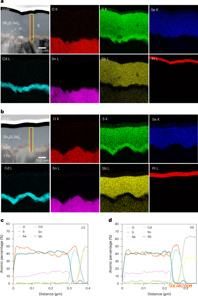 图2:元素分布。a、b, CT样品(a)和SS样品(b)的横截面TEM图像及对应的EDS元素分布图。c、d, 沿a、b图中黄色箭头方向得到的CT样品(c)和SS样品(d)的原子百分比随深度变化的分布曲线。横截面样品通过聚焦离子束(FIB)制备,监测的元素包括O、S、Se、Cd、Sn和Sb。