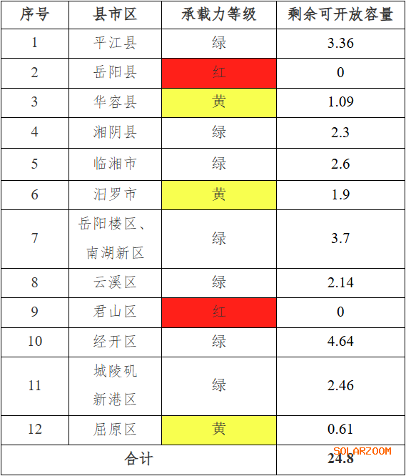 根据计算原则,国网湖南电力经营区岳阳地区各县市区分布式光伏接入可开放容量为24.8万千瓦。