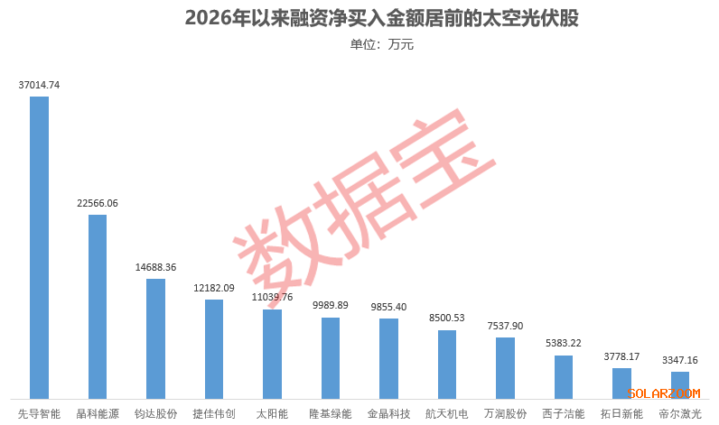 据证券时报·数据宝统计,2026年以来(截至1月21日),融资客净买入金额在3000万元以上的太空光伏股共计12只。其中,先导智能、晶科能源、钧达股份、捷佳伟创、太阳能5股净买入额均在1亿元以上,依次为3.7亿元、2.26亿元、1.47亿元、1.22亿元、1.1亿元。