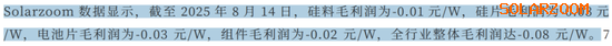 产能过剩直接导致全行业亏损。Solarzoom数据显示,截至2025年8月14日,硅料毛利润为-0.01元/W,硅片毛利润为-0.03元/W,电池片毛利润为-0.03元/W,组件毛利润为-0.02元/W,全行业整体毛利润为-0.08元/W。