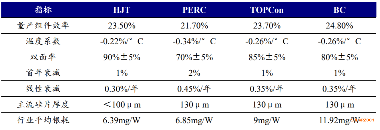 低衰减及低温度系数:当前主流HJT组件首年衰减率仅为 1%,全生命周期线性衰减率低于 0.3%/年,综合衰减表现优于PERC、TOPCon等其他晶硅电池技术路线。在温度系数方面,主 流 HJT 组件温度系数低至-0.22%/°C,相较 PERC(-0.34%/°C)、TOPCon(-0.26%/°C)及 BC 电池(-0.26%/°C)具备比较优势,更适合太空环境。