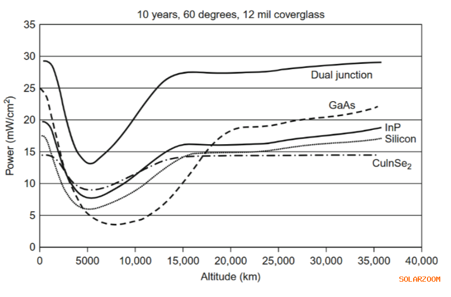 图:光谱分布的改变会导致电池整体转换效率下降(左),低中轨道的高辐射对光伏电池功率影响很大