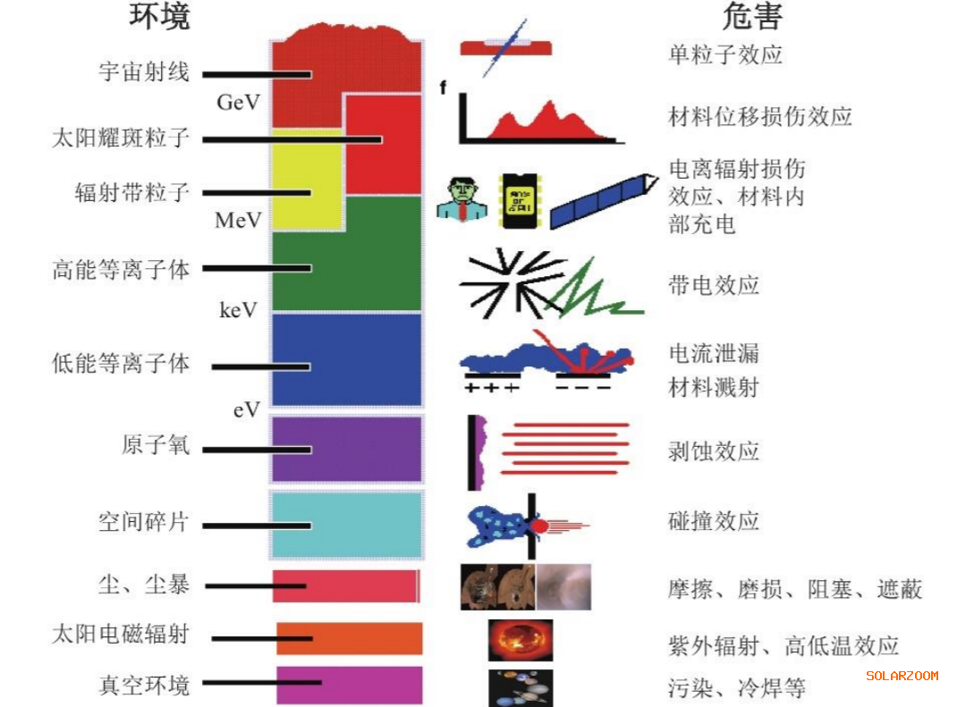高能宇宙辐射:1)光谱分布的改变通常会导致电池的整体转换效率下降;2)辐射对光伏电池材料的电子结构产生影响,导致转换效率下降,并影响电池寿命。