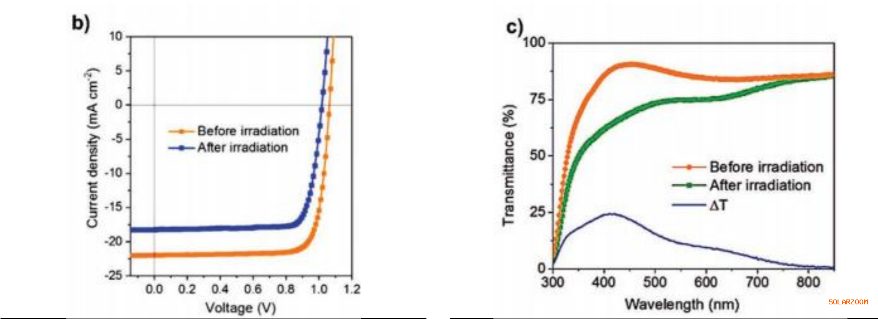 图:高剂量γ射线辐射前后J–V曲线(左),辐照前后透射率变化(右)