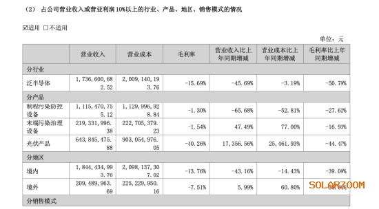从结构看,光伏并未如预期成为第二增长曲线。2024年,光伏电池片业务贡献收入6.44亿元,毛利率为-40.26%,属于典型的亏损销售;同年公司的核心业务板块制程污染防控设备收入的大幅减少,其降幅高达65.68%。