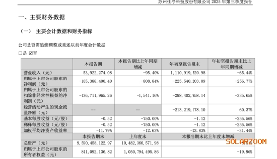 2025年10月披露的三季报,将这场跨界的后果进一步具象化。仕净科技2025年的前三季度实现营收11.11亿元,同比下滑65.44%,归母净利润亏损2.26亿元,,同比降幅高达256.77%。单看节奏更为陡峭,第三季度营收仅5392.23万元,环比、同比双双断崖式下滑。