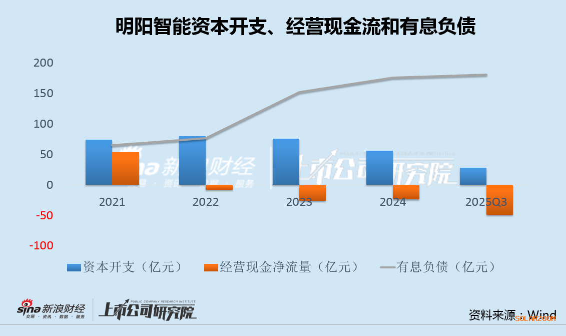 与此同时,明阳智能经营现金流持续净流出,2022年初至2025年三季度末,累计净流出额达107亿元,而资本支出长期保持高位,公司资金入不敷出,有息负债从76亿升至181亿,三年增幅达140%。