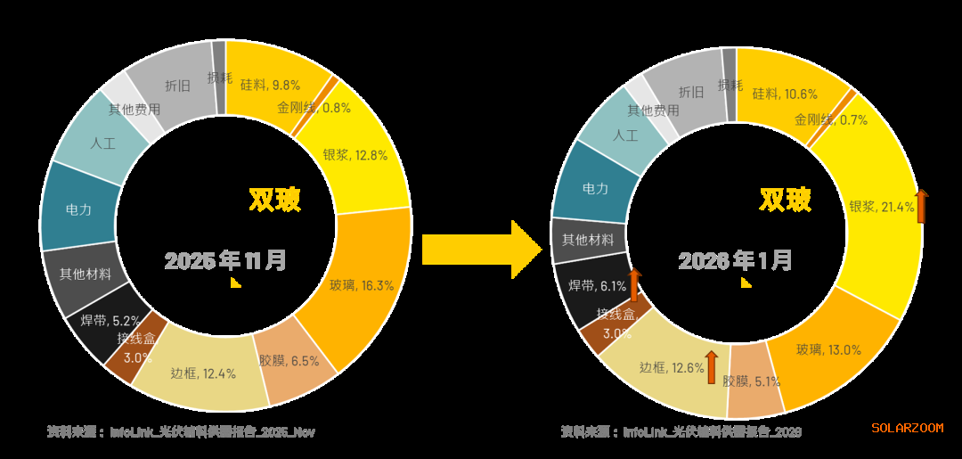InfoLink在报告中介绍,根据《InfoLink_光伏辅料供需报告》调研,对比 2025年11月版本和2026年1月版本辅料在组件中的占比,以TOPCon双玻一体化为例:
