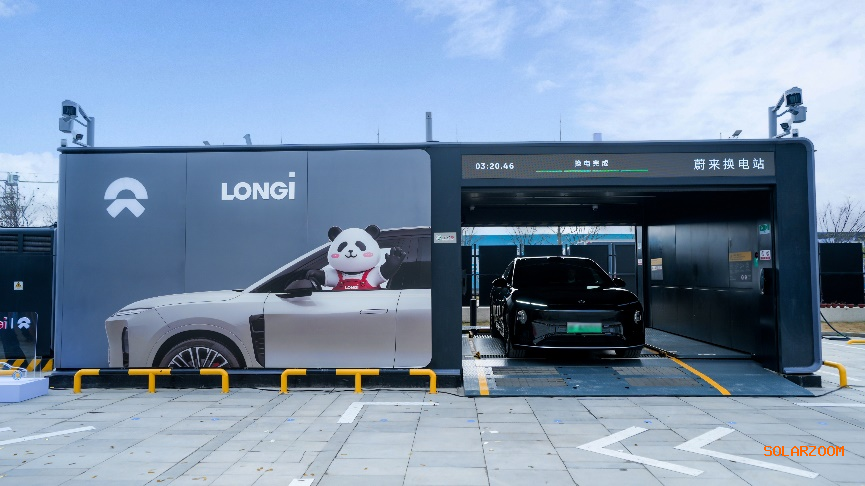 落成仪式上,蔚来ET9于全新落成的光伏换电站完成了首次换电服务。该换电站顶部全部采用隆基专为蔚来定制的Hi-MO X10全黑组件,搭载行业领先的BC电池技术,组件转换效率高达24.3%,确保了换电网络电力供给的绿色化与高效化。