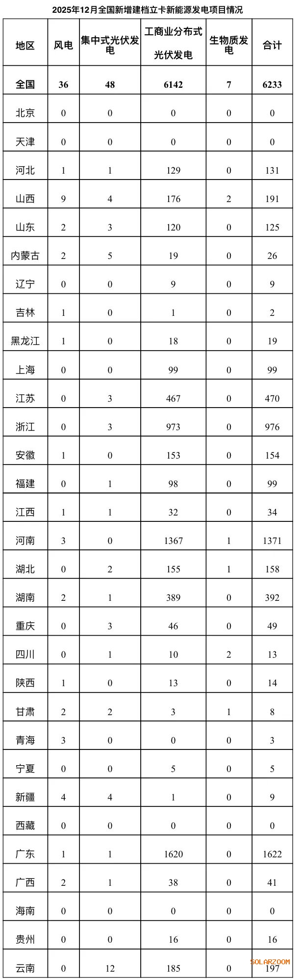 2025年12月,全国新增建档立卡新能源发电(不含户用光伏)项目共6233个,其中风电项目36个,光伏发电项目6190个(集中式光伏发电项目48个,工商业分布式光伏发电项目6142个),生物质发电项目7个。风电、集中式光伏发电、生物质发电项目清单见附件,工商业分布式光伏发电项目清单详见国家可再生能源发电项目信息管理平台网站(网址https://jdlk.renewable.org.cn/card-info-sheet/)。