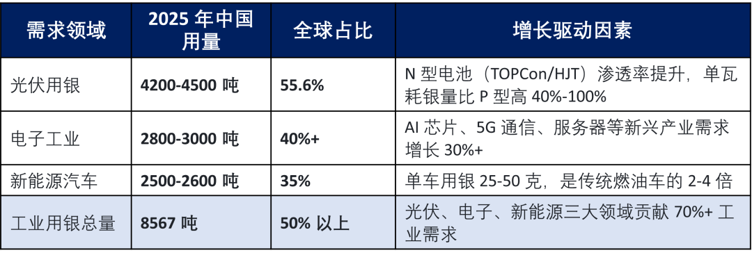 光伏用银占工业需求35%,2026年全球光伏新增装机预计350-400GW,带动银需求增长12%-15%;AI芯片、5G等新兴产业进一步推高工业用银占比至60%。
