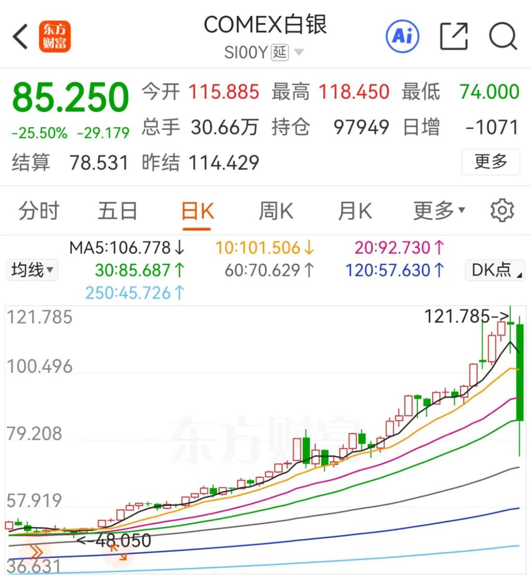 昨夜今晨,COMEX白银期货(纽约银)暴跌25.50%,报收85.25美元/盎司,从121.785美元的昨日历史高位,到74美元的今晨最低,最大振幅近40%。沪银主力连续合约暴跌17%,直接跌停。如果没有跌停限制,跌幅大概率也会在25%左右。