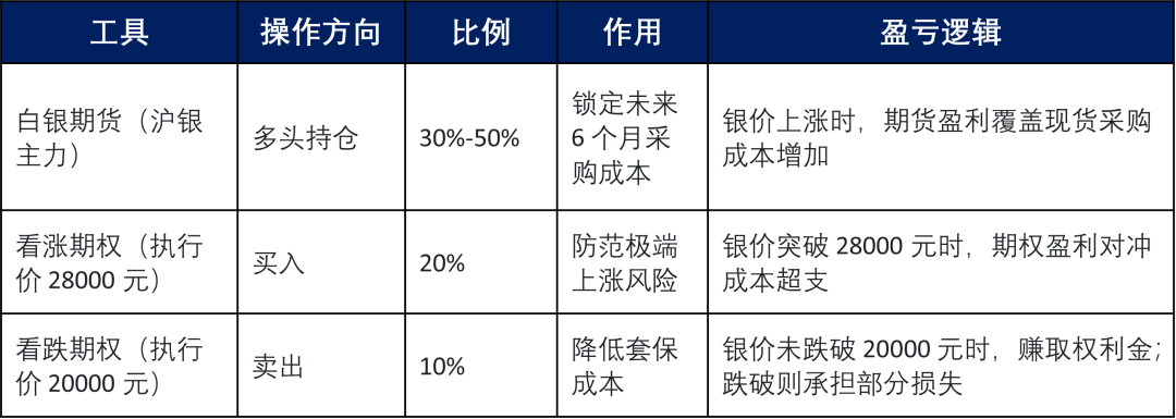 银价短期继续下跌(如跌到18000 元),现货囤货盈利+卖出看跌期权少量亏损,净收益为正;银价中期反弹(如至30000元),期货+期权盈利覆盖现货采购成本增加,锁定成本上限。