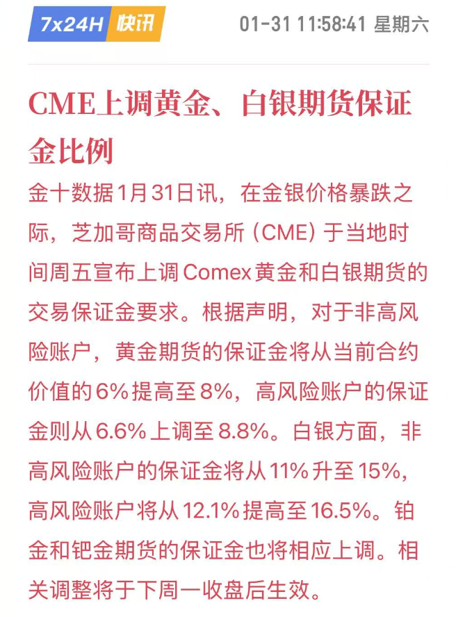 多头惊魂未定之时,又遭致命补刀,助推黄金白银跌势:芝加哥商品交易所(CME)宣布上调Comex黄金和白银期货的交易保证金要求。白银非高风险账户的保证金将从11%升至15%,高风险账户将从12.1%提高至16.5%,相关调整将于下周一收盘后生效。这一举措比沃什上台更致命,直接加剧了多头的资金压力,迫使更多杠杆持仓被迫平仓,势必进一步放大跌幅。至此,这场由蝴蝶扇动翅膀引发的风暴,在多杀多踩踏与监管政策的双重作用下,最终演变为贵金属市场的一场史诗级崩盘,从而也为深陷成本压力的光伏行业送来了喘息之机。