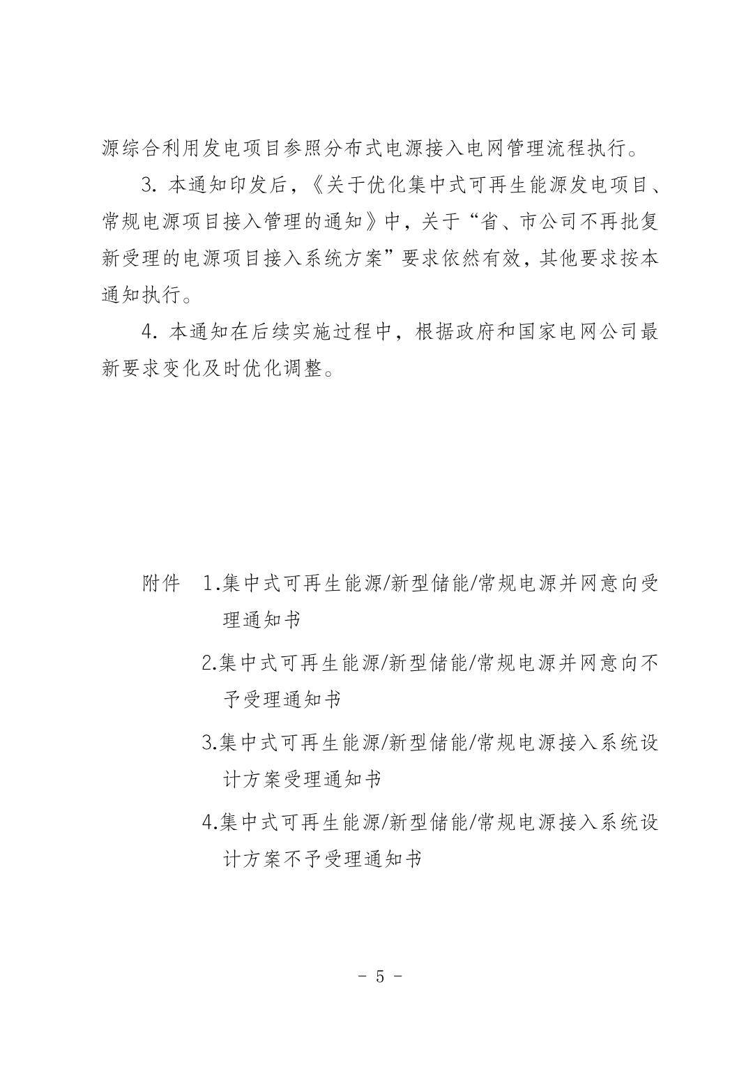 通知强调, 优化集中式风光储、常规电源项目接入管理。并网意向、接入系统设计方案受理答复均为 5 个工作日。