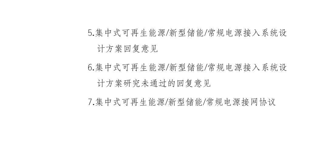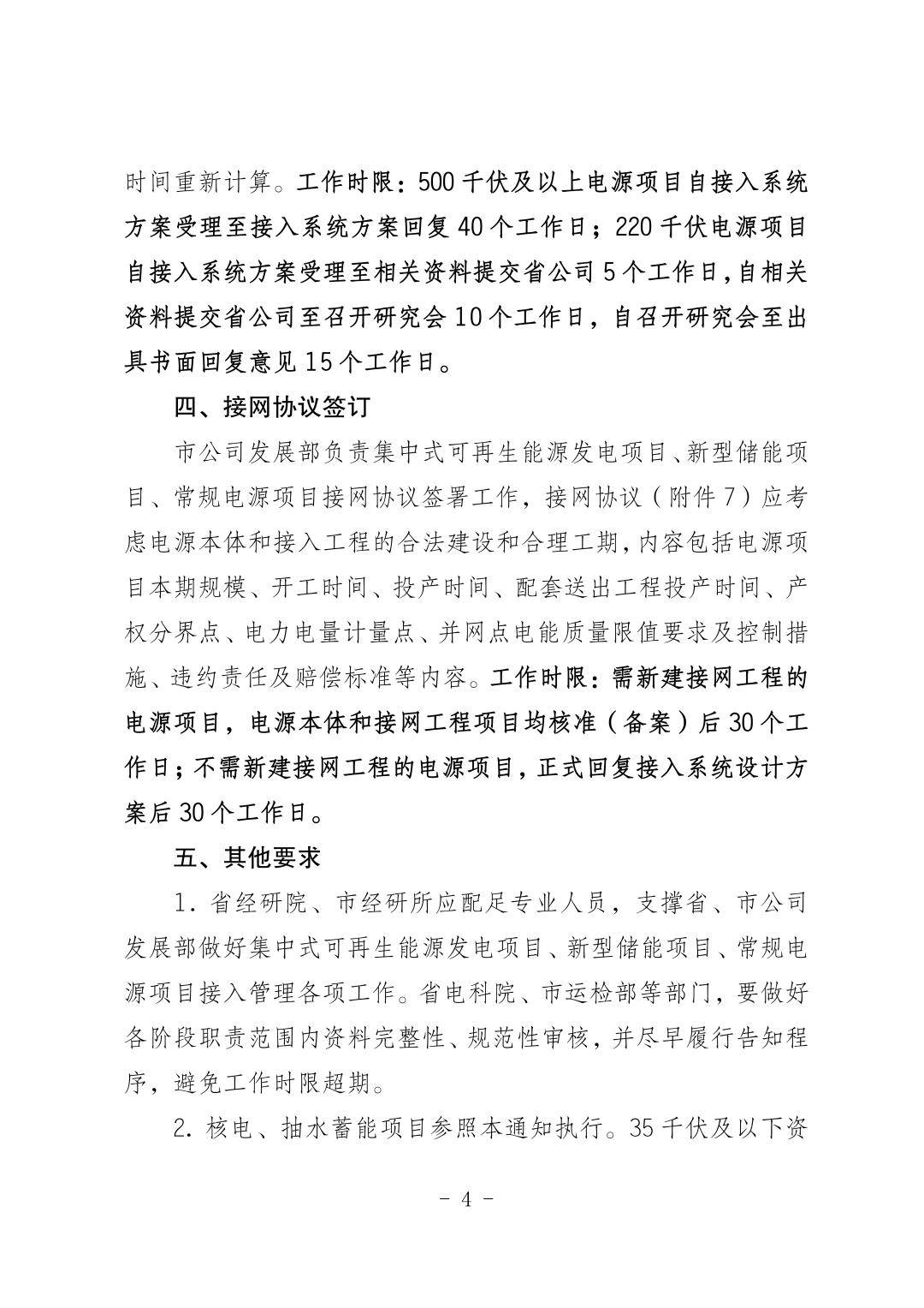 接入方案研究按电压分级限时:110kV 项目 30 个工作日,35kV 及以下 20 个工作日;220kV 项目提交省公司 5 个工作日、开会 10 个工作日、回复 15 个工作日;500kV 及以上 40 个工作日。