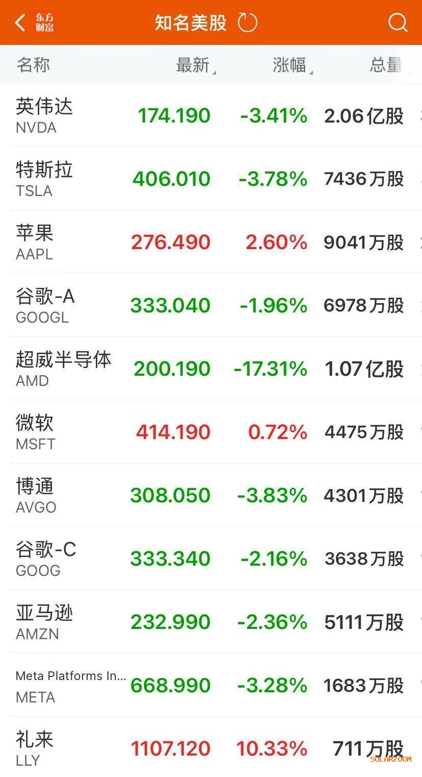 按照市值排名,截至收盘,英伟达跌3.41%、苹果逆势上涨2.6%、谷歌-A跌1.96%、微软涨0.72%、亚马逊跌2.36%、Meta跌3.28%、台积电跌2.98%、特斯拉跌3.78%、博通跌3.83%、伯克希尔哈撒韦-A涨2.4%、礼来涨10.33%。