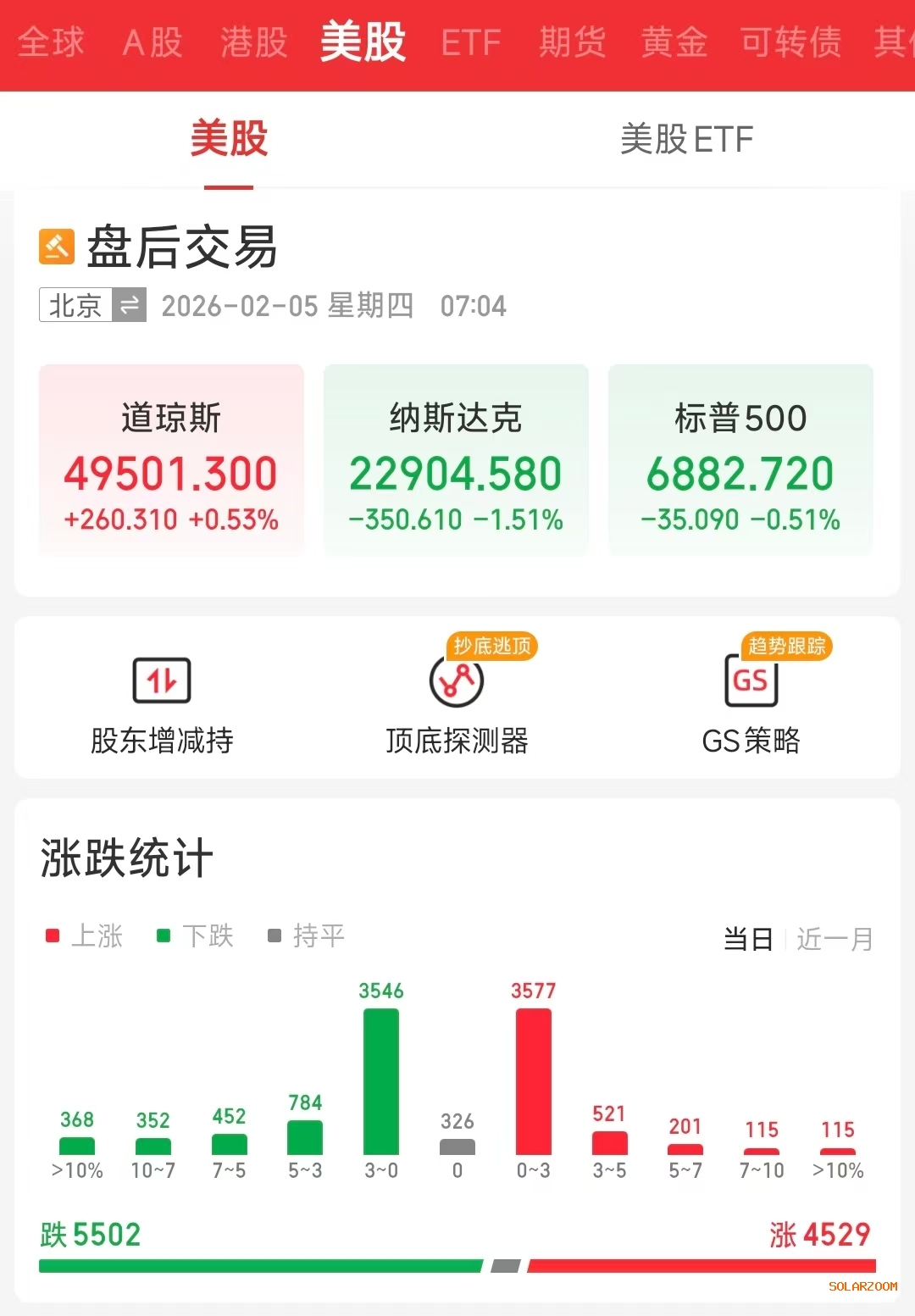 当地时间2月4日,美股三大指数涨跌不一,科技股大跌,纳指连续两天跌超1%。截至收盘,标普500指数跌0.51%,报6882.72点;纳斯达克综合指数跌1.51%,报22904.58点;道琼斯指数涨0.53%,报49501.3点。