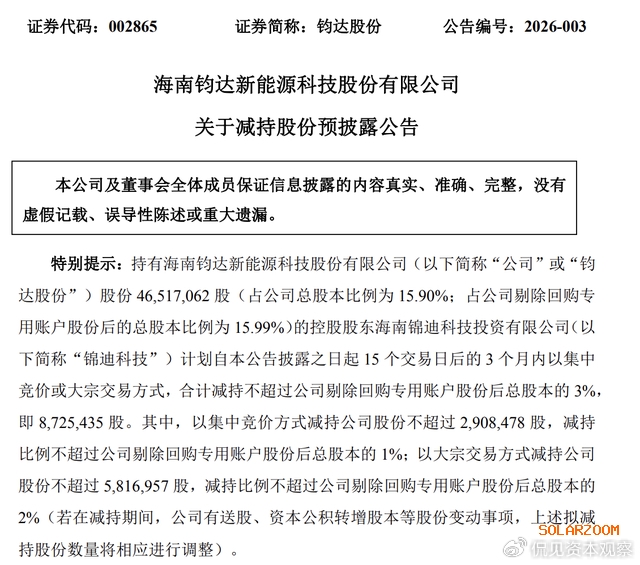 此外随着钧达股份股价的暴涨,其控股股东的减持也被市场所关注。根据其发布公告,钧达股份控股股东锦迪科技拟减持公司约3%的股份,即约872.54万股。若按照最新收盘价格计算,其减持金额约为9.97亿元。