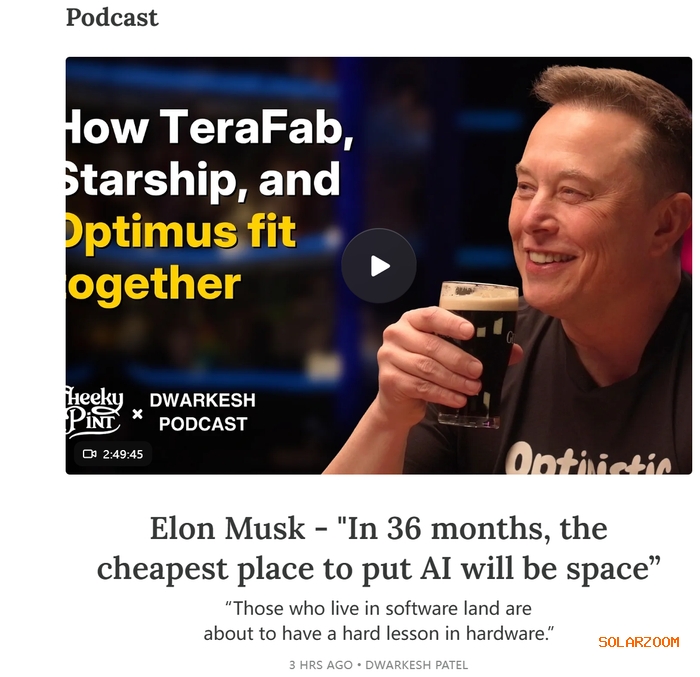 随后马斯克又意犹未尽地重申:“你可以记住我这句话。在36个月之内,甚至更可能接近30个月,把AI放在太空最具经济吸引力。而且从那之后,放在太空里的优势会变得好得离谱。”