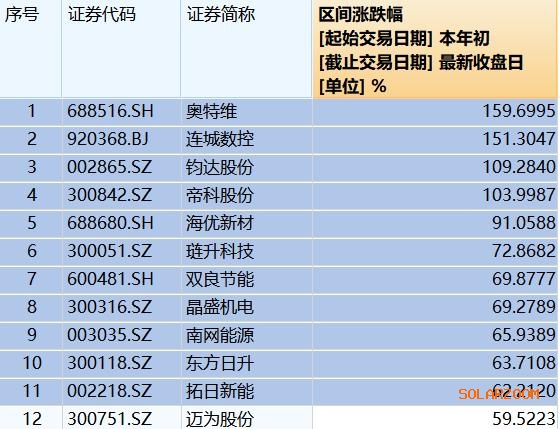 进入2026年,光伏产业链股价整体出现明显反弹。据时代周报记者不完全统计,截至2月4日,奥特维(688516.SH)、连城数控、钧达股份(002865.SZ)、帝科股份年内涨幅已超过100%;海优新材(688680.SH)、琏升科技(300051.SZ)、双良节能(600481.SH)、晶盛机电、南网能源(003035.SZ)、东方日升(300118.SZ)、拓日新能(002218.SZ)等多只个股涨幅超过60%。