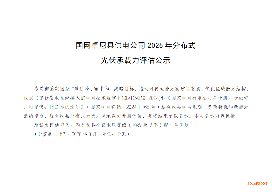 2月5日,国网卓尼县供电公司2026年分布式光伏承载力评估公示。