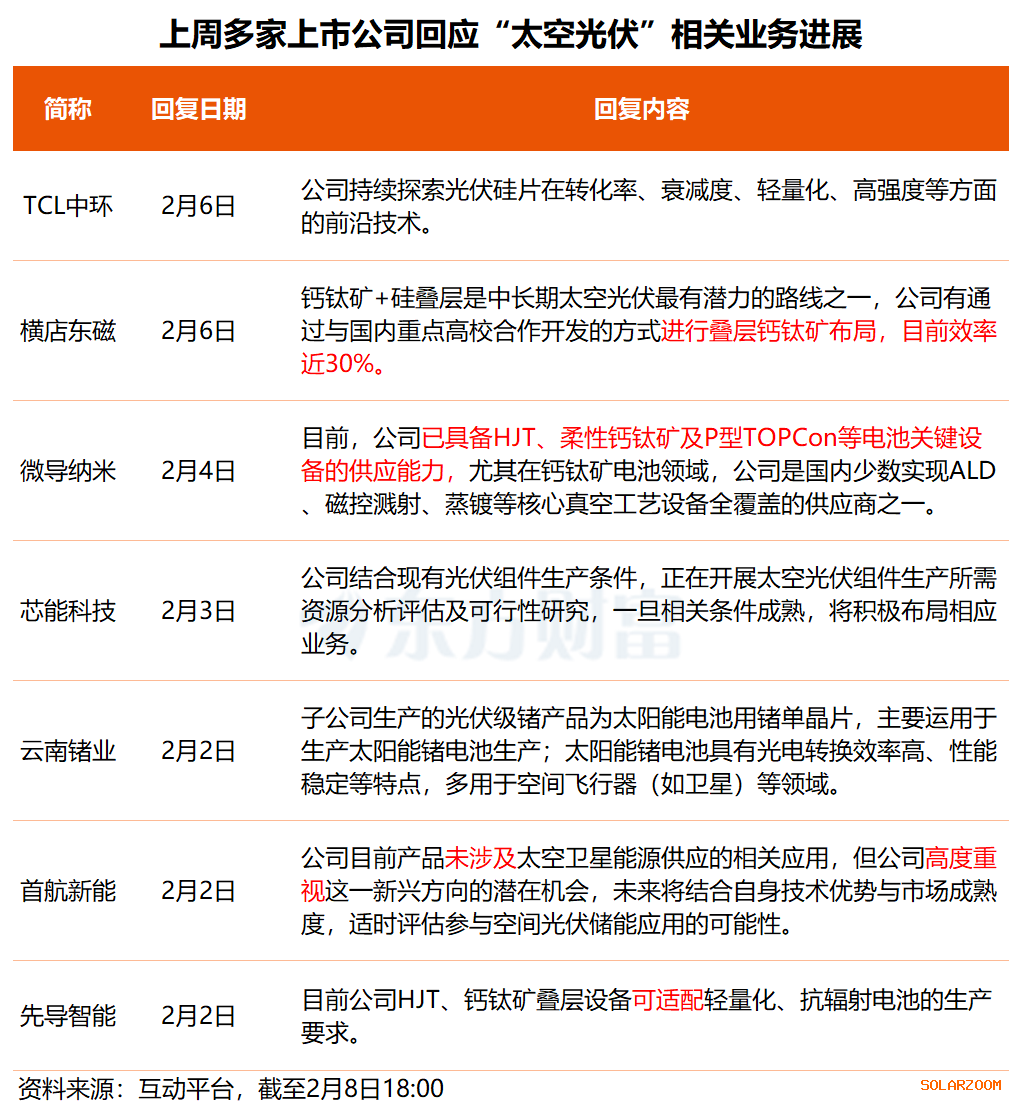 据东方财富不完全统计,上周有多家上市公司在互动平台对太空光伏相关提问进行了回复: