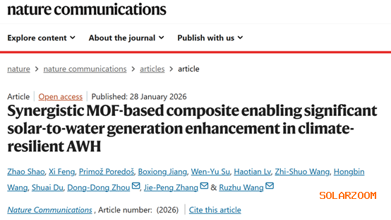 近日,上海交通大学机械与动力工程学院制冷与低温工程研究所王如竹教授领衔的ITEWA团队与中山大学张杰鹏教授团队合作,针对太阳能驱动的空气取水技术中存在的夜间吸附与日间解吸热力学失配问题,提出了一种基于协同MOF复合材料的太阳能空气取水解决方案,实现了广气候区域内仅凭太阳能驱动的高效水生产。该项研究成果以“Synergistic MOF-based composite enabling significant solar-to-water generation enhancement in climate-resilient AWH”为题发表在Nature Communications上。制冷与低温工程研究所博士生邵昭、中山大学博士生冯茜为论文共同第一作者,王如竹教授,中山大学张杰鹏教授、周东东教授为论文通讯作者。