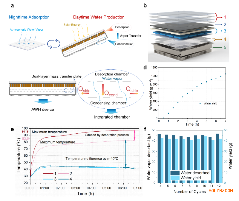 优异的材料性能需要匹配高效的系统设计才能转化为实际产水量。针对光热驱动AWH系统中解吸(需高温)与冷凝(需低温)的热设计需求矛盾,团队使用了一种高度集成的可扩展模块化SAWH装置。该装置采用双层绝热传质板设计,成功在紧凑的空间内实现了吸附床热域与冷凝室冷域的有效解耦与热分区。最终通过削弱吸附床与冷凝壁面间热量传递,同时实现了提升解吸温度与降低冷凝温度的双重目标。凭借装置热设计优化与高性能复合材料结合,装置展现出较好的低光照适应性,即便在400 W m⁻2的弱光照强度下(常见典型夏季正午阳光辐照强度可达1000 W m⁻2或更高),仍能实现超过500 g m⁻2的产水。同时在各辐射条件下,该装置整体产水量均较未复合LiCl的Ni2Cl2(BTDD)系统提升了25%以上,其中在1000 W m⁻2下7小时内每平米产水超1 L,产水体积密度达30.3 L m⁻3.