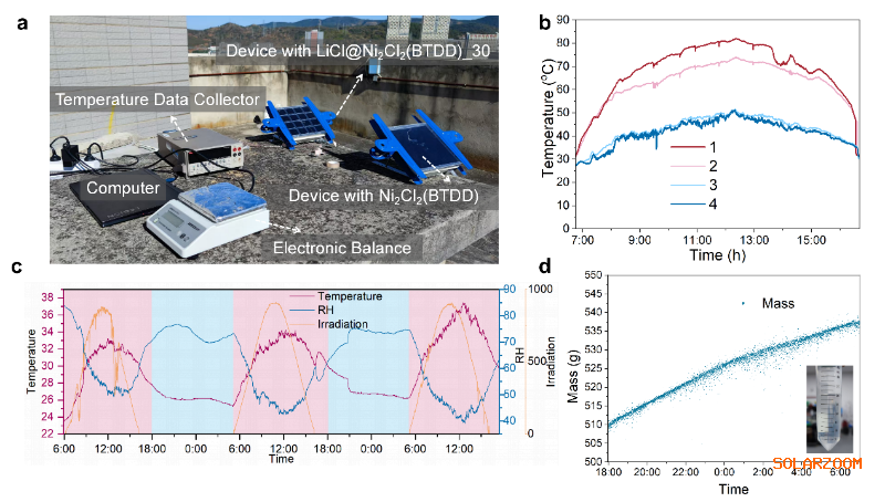 图二 搭载LiCl@Ni2Cl2(BTDD)_30的太阳能驱动空气取水装置实验室性能测试结果