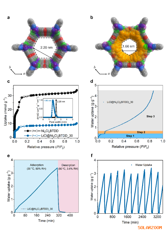 针对现有吸附剂在吸附容量与解吸温度之间的权衡难题,研究团队首先从材料吸附机理入手,构建了主客体协同的复合吸附体系。团队筛选出兼具大孔容(1.18 cm3 g⁻1)及高循环稳定性的MOF材料Ni2Cl2(BTDD)作为基质,通过优化后的浸渍法引入高吸湿性的LiCl盐进行负载。氮气吸附与孔径分布分析显示,在优选的30 wt% LiCl溶液复合后的复合材料LiCl@Ni2Cl2(BTDD)_30孔径从2.20 nm减小至1.66 nm,同时配合PXRD、TOF-SIMS等不同表征手段综合证明了LiCl在MOF孔道内表面形成了均匀分布,从而有效避免了盐团聚。不同于Ni2Cl2(BTDD)材料“S型”吸附等温线,该复合材料呈现出多相的“三阶段”吸附行为:从低湿度的化学吸附,到中湿度的盐潮解,再到高湿度的溶液吸收,最终实现了相较于纯基质MOF材料,在全湿度域下吸附性能的提升。实验数据显示,该复合材料在30 °C/80%相对湿度下的吸水量高达3.46 g g⁻1.相当于基质材料Ni2Cl2(BTDD)相同湿度下吸附量的近4倍,同时在不同湿度区间内均实现了吸附量与吸附速率的提升。同时该复合材料对解吸温度要求低,60 °C下的低驱动温度即可实现近95%的解吸。高吸附容量与低解吸温度配合大幅降低了对太阳能热源强度的要求,可更好地适应多云等太阳能驱动空气取水系统中常见的不利气候条件,同时为全天候高效取水奠定了热力学基础。