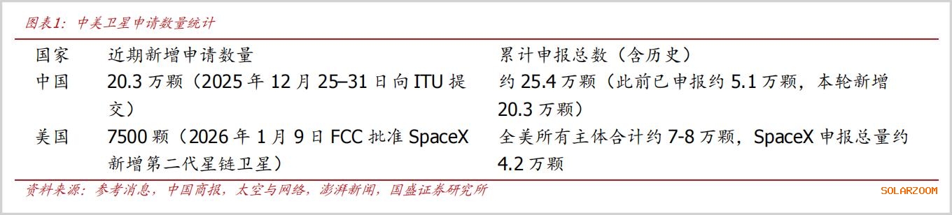 具体来看,商业航天爆发式增长是太空光伏的核心推手。在国际电信联盟(ITU)“先登先占”规则下,全球低轨卫星竞争逐渐白热化,全球多国主体纷纷推进巨型星座计划,卫星数量进入万颗级别。