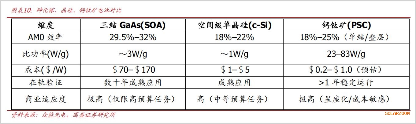 据国盛证券研究,钙钛矿叠层电池的最高实验室效率约35%,预估成本不足7元每瓦,较砷化镓电池显著下降。