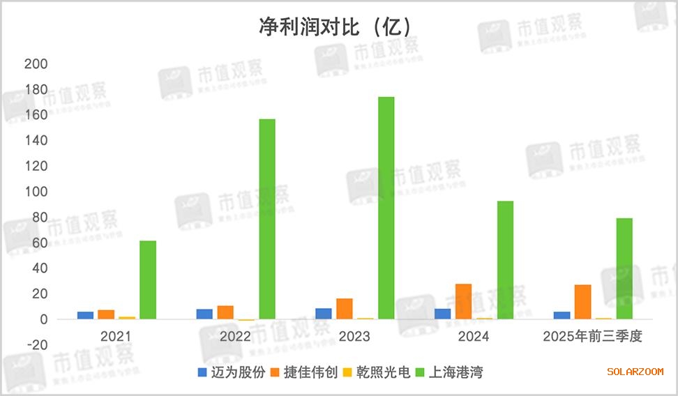 近年来,在光伏行业下行周期下三家盈利也出现了分化,捷佳伟创维持着中高速增长表现最佳,同时规模最大,这离不开其TOPCon设备市场份额领先以及多种技术路线的布局。而迈为股份自2023年后净利润陷入负增长,受行业影响较为明显。