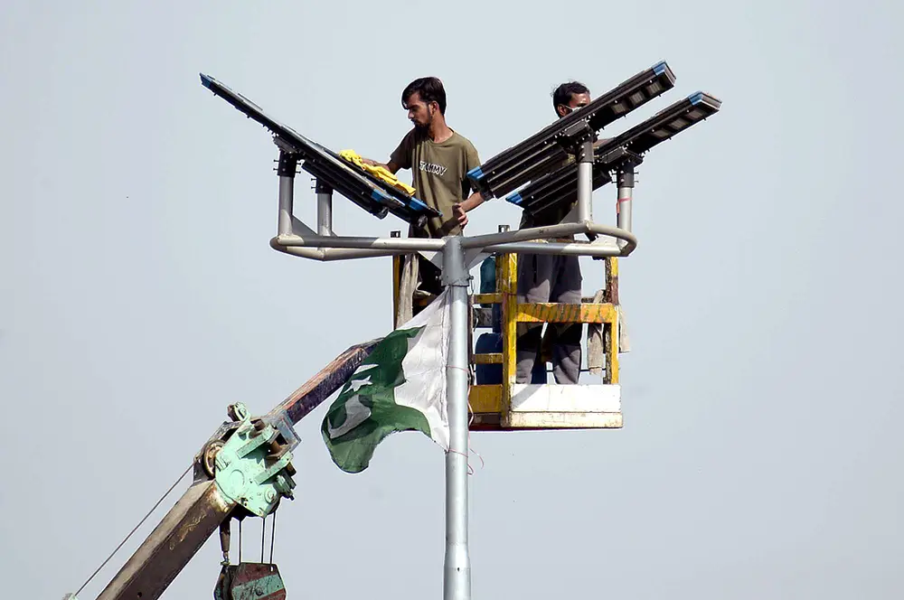2025年12月14日,巴基斯坦卡拉奇,技术人员正在对新安装的太阳能路灯进行维护工作。视觉中国 资料图