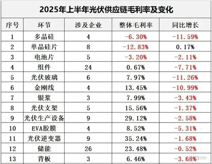 这背后,是产能过剩、价格战与原材料暴涨的现实。据钛媒体统计,2025上半年,多晶硅整体毛利率为-6.30%,组件的毛利率只有0.67%。要知道在2022年,多晶硅整体毛利率一度高达73%。