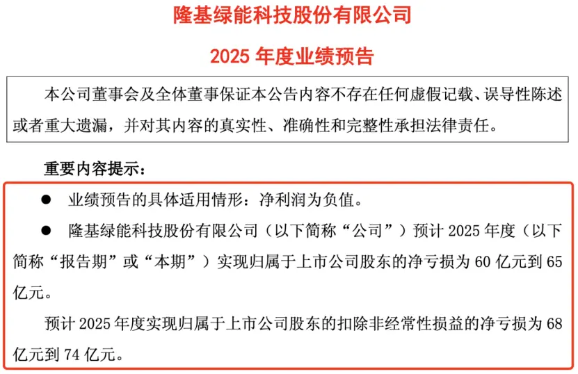 近期,隆基绿能发布业绩预告称,预计2025年度实现归属于上市公司股东的净亏损60亿元到65亿元;预计2025年度实现归属于上市公司股东的扣除非经常性损益的净亏损为68亿元到74亿元。