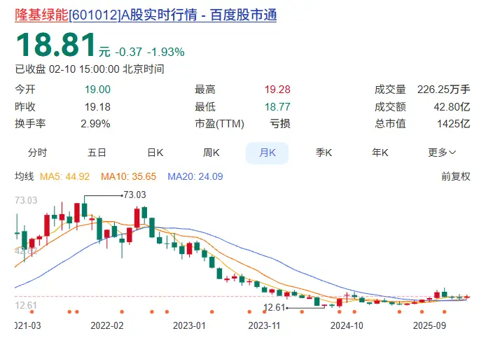 趋势同样体现在资本市场。截至2026年2月10日收盘,隆基绿能的股价为18.81元/股,相比历史高点跌去74%。