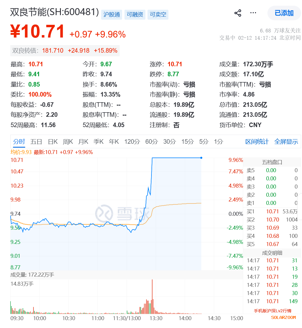 2月12日,双良节能官微官宣,获得3个海外订单,据传将用于Space X星舰发射基地扩建配套的燃料生产系统,受从消息影响,双良节能股价自下午13:00开始直线拉升,至13:30涨停封板。